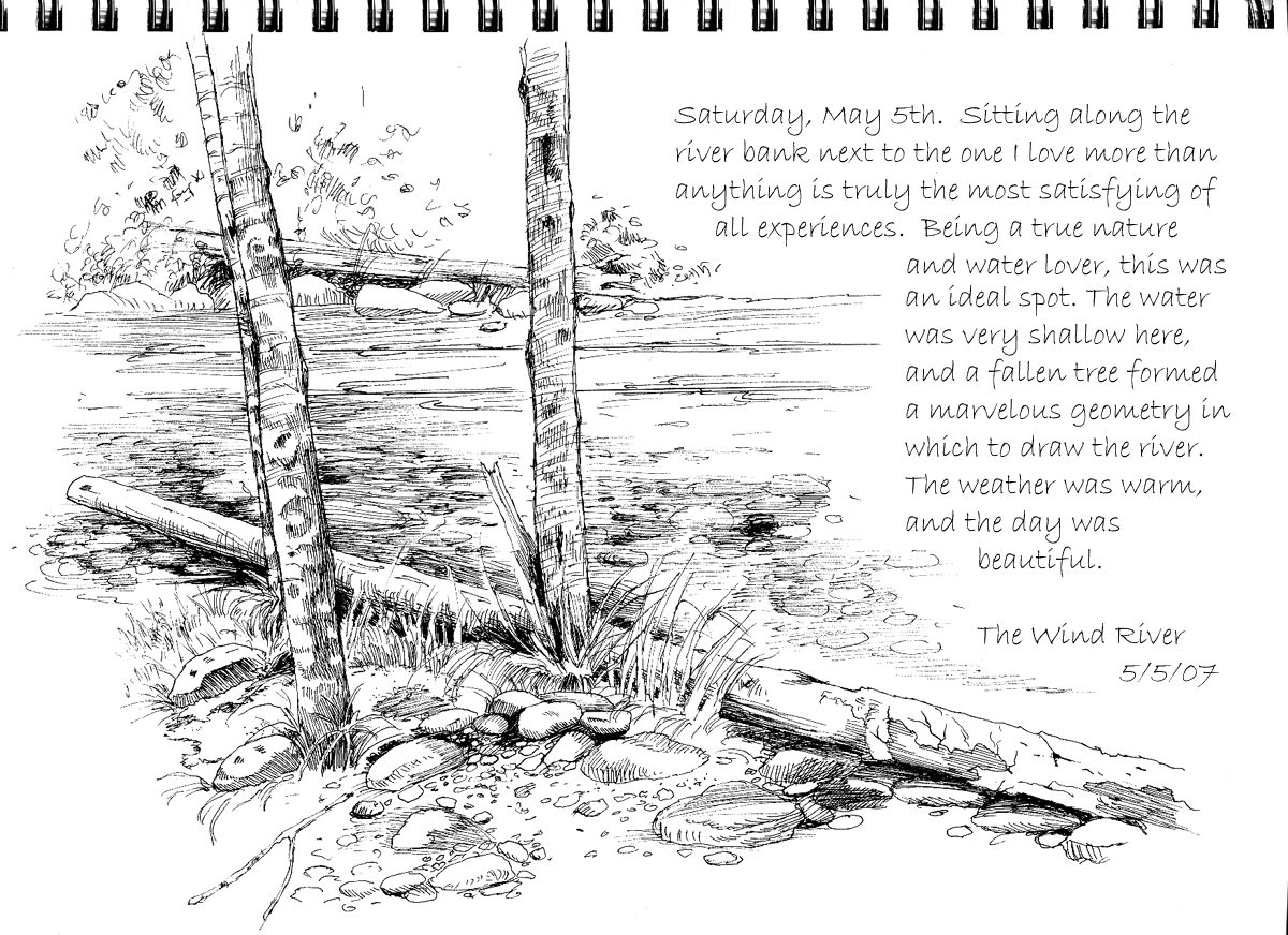 Early May. The sun came out to give us a fantastic day of journaling. Near the banks of The Wind River I sketched this piece. This was done with ink only.